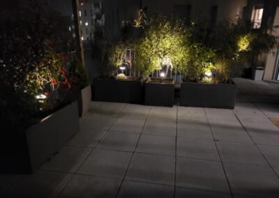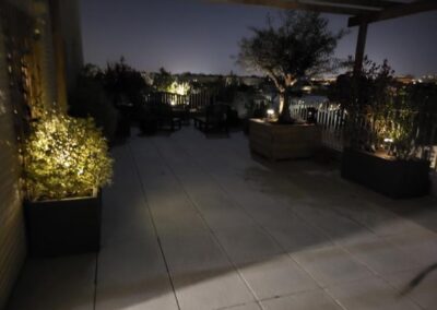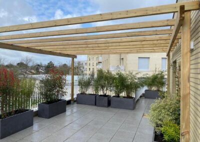 Aménagement d’un toit-terrasse au 5ᵉ étage à Saint-Herblain, pensé comme un véritable espace de vie en hauteur. Ce projet comprend la conception d’une pergola en bois, la création de bacs de plantation mêlant argile fibrée et bois recyclé, ainsi que l’installation de treillis pour plantes grimpantes. L’ensemble est complété par un système d’arrosage automatique et un éclairage basse tension, pour un extérieur à la fois fonctionnel et agréable au quotidien.